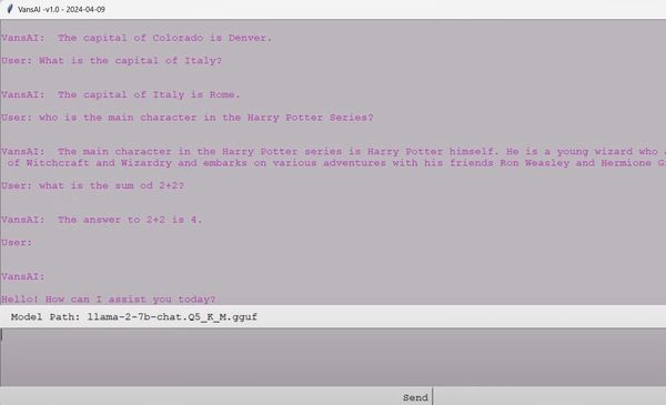 "VansAI" is a GUI application from CSC444 - Deep Learning with Python and tkinter, designed to interact with a local language model (LLM) featuring various AI personalities. It uses the llama_cpp library for model loading, allowing users to enter prompts and receive responses. The interface includes text areas for prompts and conversation history, an image display, a send button, and text-to-speech support via pyttsx3. The design prioritizes user-friendliness and customization.